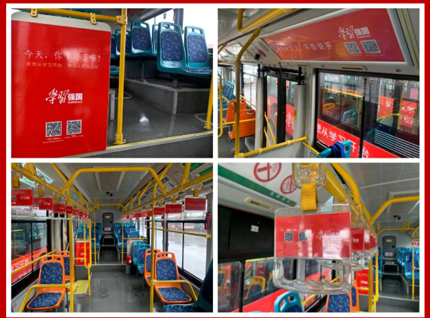 “學(xué)習(xí)強(qiáng)國(guó)”主題公交車車身色調(diào)以紅色為主,搭配“夢(mèng)想從學(xué)習(xí)開始,事業(yè)從實(shí)踐起步”的學(xué)習(xí)標(biāo)語(yǔ)格外醒目,車內(nèi)燈廂、拉手、展板等位置張貼著“學(xué)習(xí)強(qiáng)國(guó)”學(xué)習(xí)標(biāo)語(yǔ)和學(xué)習(xí)內(nèi)容,以及平臺(tái)下載、注冊(cè)等宣傳畫面,方便廣大乘客參與到學(xué)習(xí)中來(lái)。7路、108路和138路每條線路各1臺(tái)車作為宣傳“學(xué)習(xí)強(qiáng)國(guó)”主題公交車,三臺(tái)公交車線路串聯(lián)全區(qū)熱門商超、黨政機(jī)關(guān)、公園廣場(chǎng)、學(xué)校等集中性場(chǎng)所,輻射面廣,帶動(dòng)性強(qiáng)。通過(guò)車廂文化的打造,實(shí)現(xiàn)流動(dòng)學(xué)習(xí)平臺(tái),讓廣大群眾認(rèn)識(shí)到“學(xué)習(xí)強(qiáng)國(guó)”學(xué)習(xí)平臺(tái)多樣化、個(gè)性化、智能化、便捷化等特點(diǎn)。