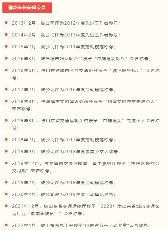 孫韻,女,中共黨員,淄博公交客運(yùn)出租分公司102路線車長(zhǎng),2011年5月參加工作。先后榮獲市交通運(yùn)輸系統(tǒng)“市民最喜愛的公交司機(jī)”,省交通運(yùn)輸系統(tǒng)“巾幗建功”先進(jìn)個(gè)人、“最美駕駛員”,2022年4月榮獲“山東省五一勞動(dòng)獎(jiǎng)?wù)?rdquo;。