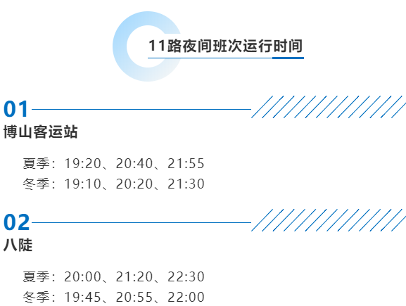11路公交車途經世紀廣場、火車站、百貨大樓、省陶瓷公司、陶琉大觀園等24個站點,串聯(lián)了博山區(qū)商業(yè)、旅游、住宅及教育文化多個區(qū)域,將搭載市民全方位感受“夜博山”的精彩與繁華。夏季博山客運站末班發(fā)車時間21:55、八陡站22:30,冬季博山客運站末班發(fā)車時間21:30、八陡站22:00,共3個發(fā)班次。