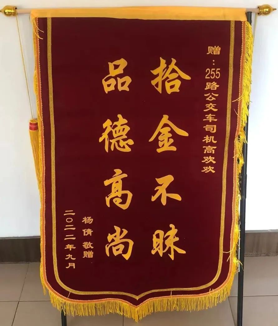 高歡歡即將登上頒獎臺的前一天,9月26日,“拾金不昧 品德高尚”這面錦旗在淄博市公共交通有限公司臨淄分公司營運(yùn)辦公室格外顯眼,這是市民楊倩女士特意為高歡歡制作的。