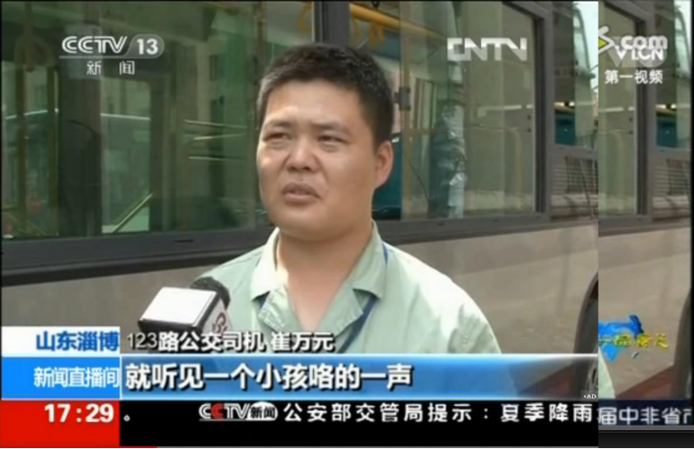 2013年6月18日,時(shí)任123路車長的崔萬元駕駛公交車到達(dá)大成農(nóng)藥宿舍附近,聽到后排乘客抱著的孩子發(fā)出急促的打嗝聲,從后視鏡中發(fā)現(xiàn)孩子不斷抽搐,崔萬元見狀立即撥打了120急救電話,并在征得乘客同意后,將車開到了附近醫(yī)院。孩子因高燒驚厥,幸虧救治及時(shí)才脫離危險(xiǎn)。
