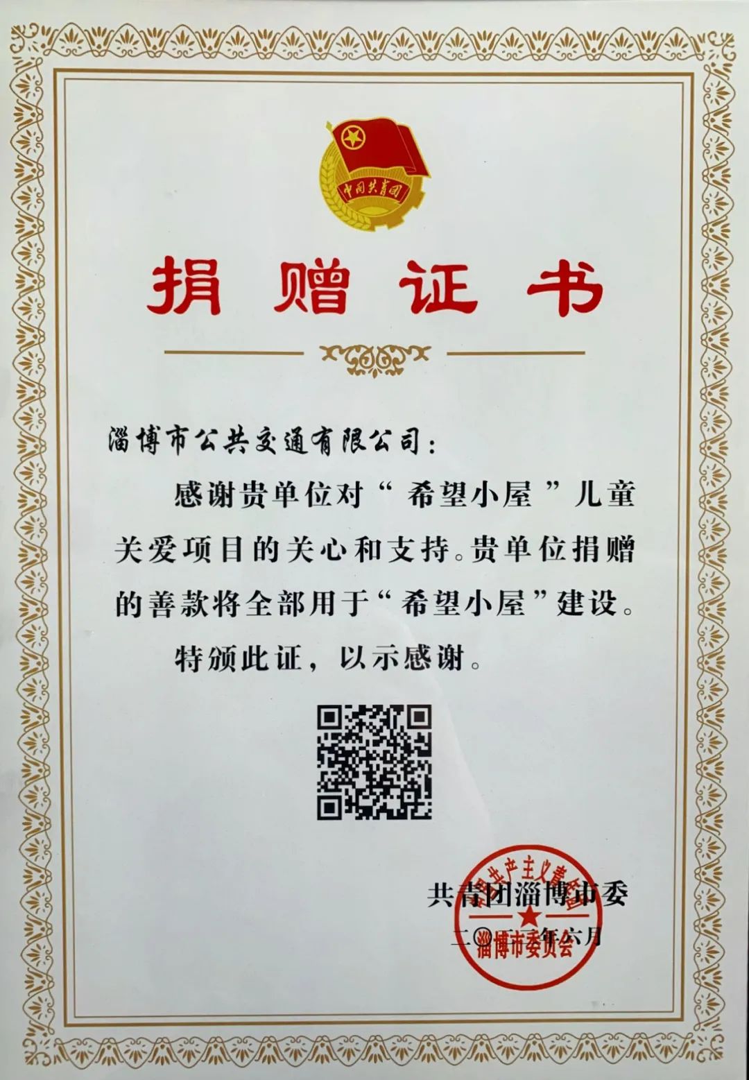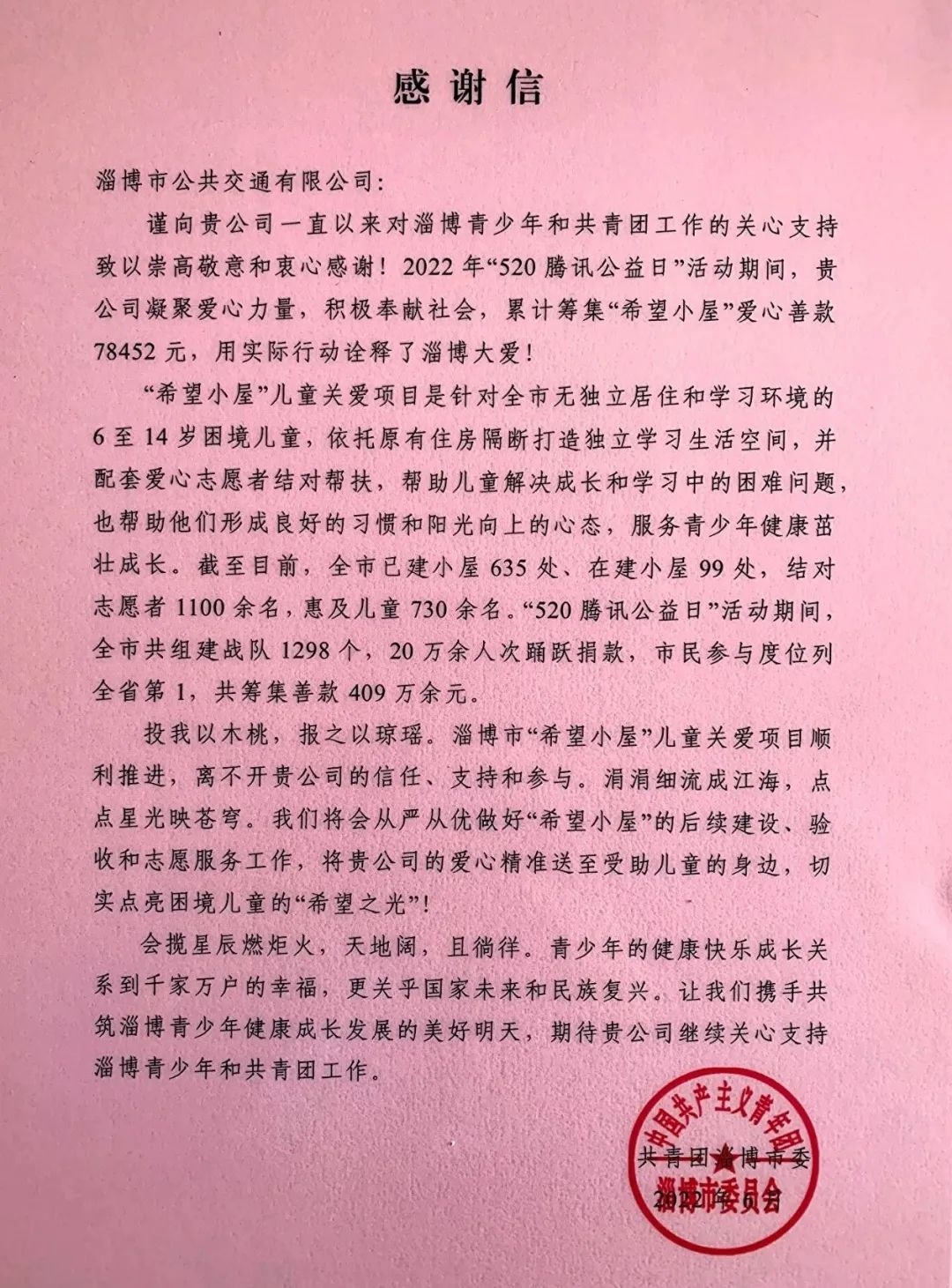 近日,公司收到共青團(tuán)淄博市委發(fā)來(lái)的捐贈(zèng)證書(shū)和感謝信,對(duì)今年“520騰訊公益日”活動(dòng)期間,公司捐資支持“希望小屋”項(xiàng)目的善舉,表示肯定和感謝。