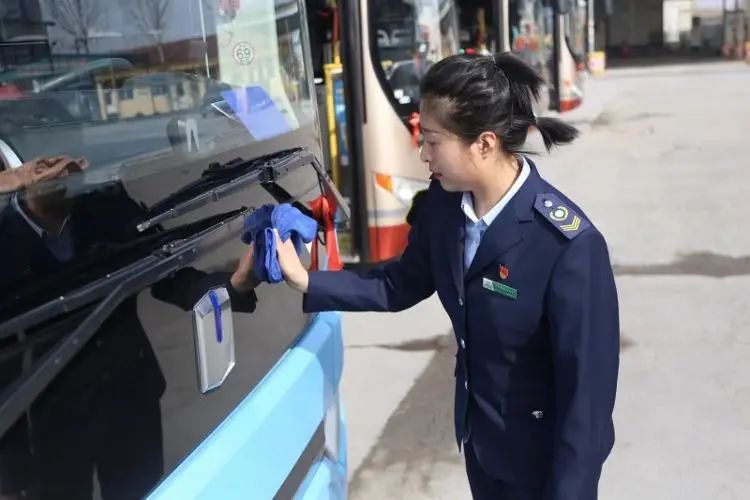 凌晨四點,天還未亮,呂丞丞的一天便已開始。“今天我是頭班車,五點半就要發(fā)車。”當記者來到公交公司時,呂丞丞正在擦拭車輛,個子不高的她將頭發(fā)全都籠在后面,動作之中充滿了干練。“這個季節(jié)灰塵較多,扶手、窗臺一天最少擦兩遍,要給乘客一個舒適、整潔的乘車環(huán)境。”呂丞丞邊擦車邊說道。