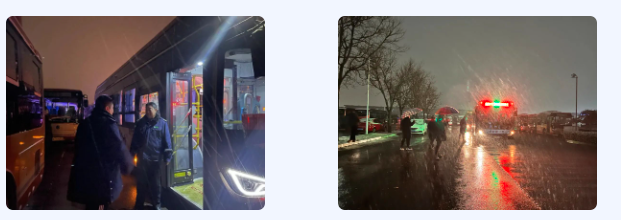 今天上午,降雪不停,城區(qū)路面出現(xiàn)冰雪混合的情況,道路通行條件十分復(fù)雜,為了克服困難,公交人迅速集結(jié),力保市民出行。在公交車上,公交車長打起十二分精神,保持車距、謹(jǐn)慎駕駛;在維修車間,修理工不畏嚴(yán)寒鉆進(jìn)車底維修車輛;在公交站頭,站務(wù)員耐心幫扶乘客上下車;在各個(gè)場站,管輔人員破冰除雪、細(xì)心叮囑。在大雪紛飛的站臺(tái),公交志愿者已把站臺(tái)清掃干凈,為防止乘客滑倒,還將防滑墊鋪在了車廂,他身旁的同事也忙著在路上撒鹽,過往行人紛紛點(diǎn)頭稱贊。當(dāng)然,除了“前線”的公交人,在“幕后”的熱線接線員和智能調(diào)度員耐心回應(yīng)乘客咨詢,合理調(diào)配車輛運(yùn)行,也都為應(yīng)對(duì)風(fēng)雪,服務(wù)市民出行貢獻(xiàn)著積極力量。